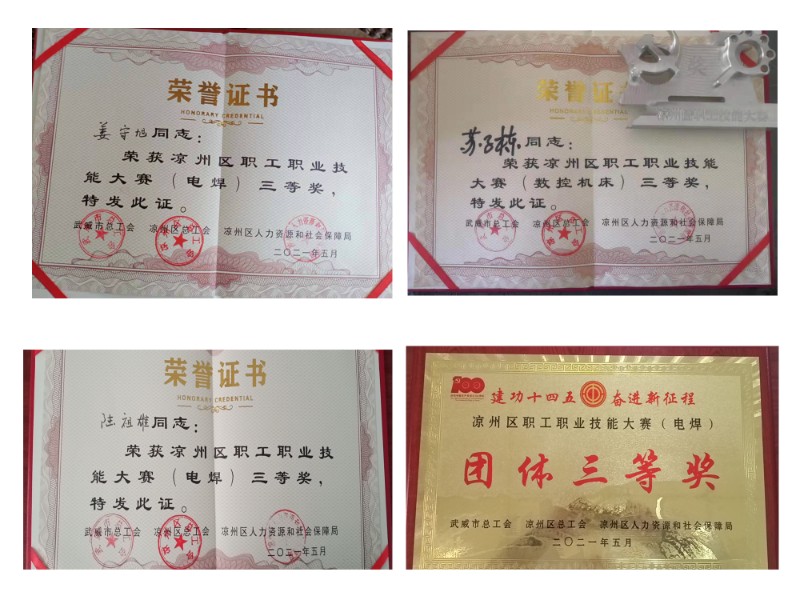 此次大赛分为电焊、叉车、数控机床、电工技能竞赛,其中焊接技能竞赛板块设有管管对接多层焊接项目,要求参赛选手在三十分钟内使用二氧化碳气体保护焊,焊接位置水平对接转动多层焊,经过监考裁判和评委会专业评判,新能源公司陆祖雄、姜守旭两位同志荣获凉州区职工职业技能大赛(电焊)三等奖,陆祖雄、姜守旭、杨硕三位同志荣获凉州区职工职业技能大赛(电焊)团体三等奖。此外,在数控机床竞赛板块,我公司苏子栋同志荣获凉州区职工职业技能大赛(数控机床)三等奖。下午,主办方为获奖同志颁发荣誉证书,至此,此次大赛圆满结束。