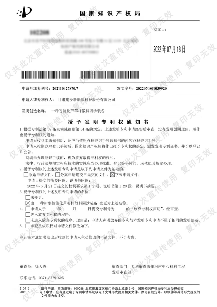 近日,甘肃建投新能源科技股份有限公司获得由国家知识产权局授权发明专利1项,名称为《一种智能化芦苇杆散料固沙装备》,授权实用新型专利3项,名称为《一种风电塔筒筒节U型吊具》《一种检测筒体不同内径的校圆工具》《一种风电塔筒筒节组对过程错边矫正工装》。