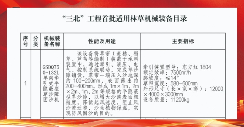 近期,国家林业和草原局正式发布了《“三北”工程首批适用林草机械装备》目录,全国共计28个机械装备入选。金宝慱亚洲体育高性能治沙机械产品GSDQ750-132L单向牵引式半隐蔽型草沙障固沙机凭借其卓越的性能和创新技术,成功入选目录榜首。