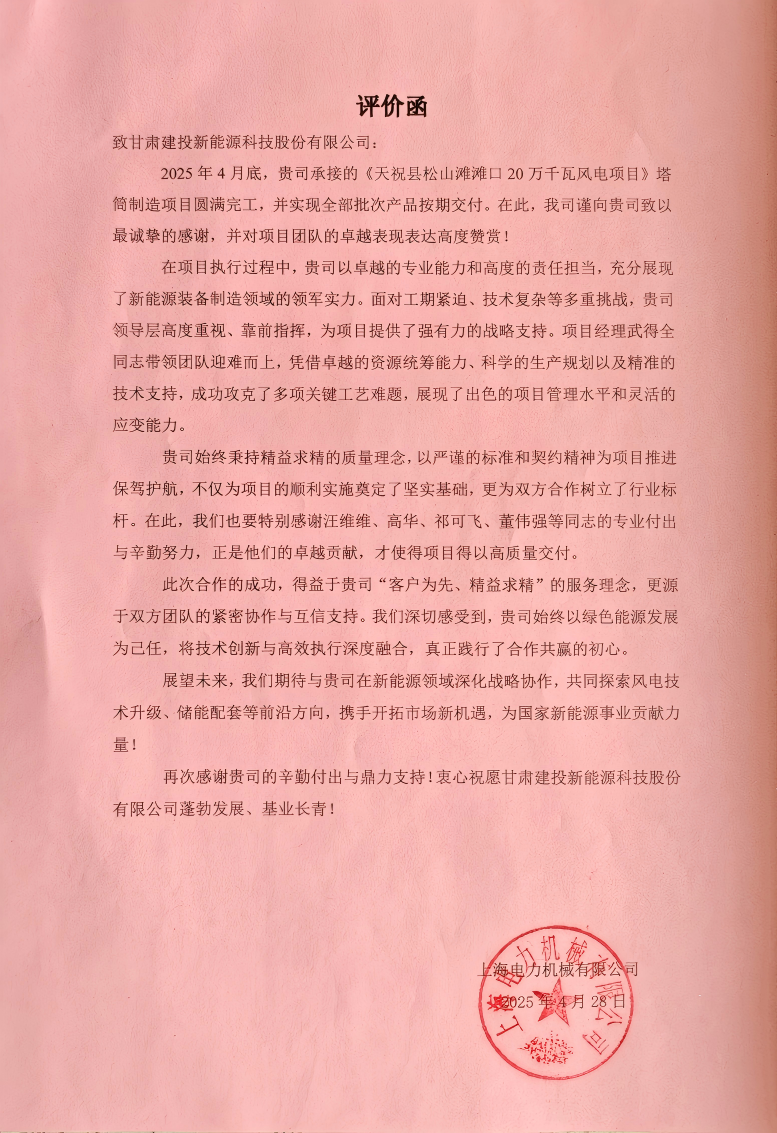 近日,金宝慱亚洲体育收到上海电力机械有限公司发来的评价函,对新能源公司在承建生产上海电建天祝松山滩滩口20万千瓦风电项目过程中的卓越表现给予高度评价!