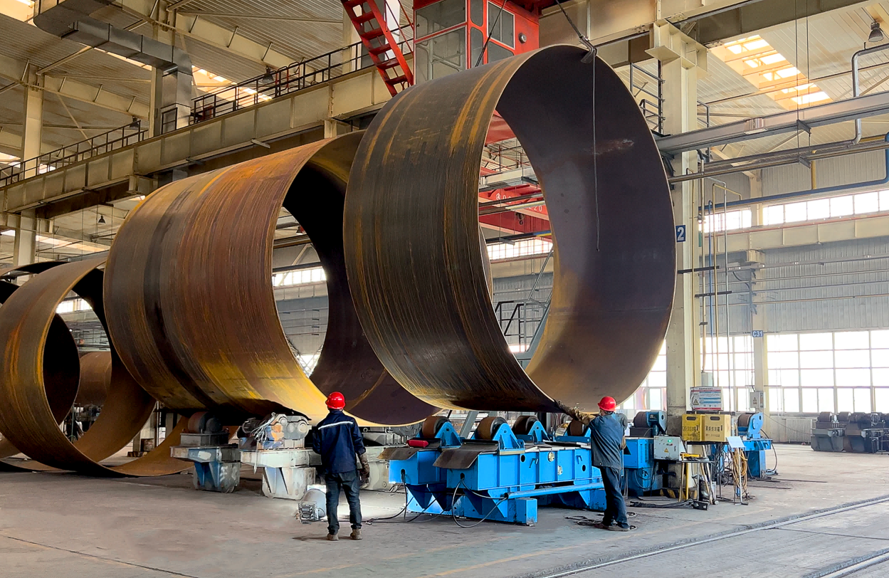 踏入新能源公司本部生产车间,工业交响曲激昂奏响。切割设备精准运转,卷板机械有力起伏,焊接火花璀璨绽放,各道工序紧密衔接、井然有序。这里承建的金风科技白银靖远山东绿色能源一期风电场项目、上海电建松山滩滩口 200MW风电项目、甘肃定西通渭“十四五”第二批集中式风电项目等多个甘肃省重点风电项目正紧张施工中。生产线上,工人们将一段段筒圈精准组对,随着机械的运转,巨大的筒圈被缓缓吊起、对接。直径达5.3米的巨型塔筒在精密操作下逐步成型。每套由5段组成、每段包含10个单节的塔筒,需历经下料、卷板、纵缝、回圆、组对、环焊、内件、检测、防腐等复杂且严谨的工序,每一步都凝聚着建设者的匠心与专注。