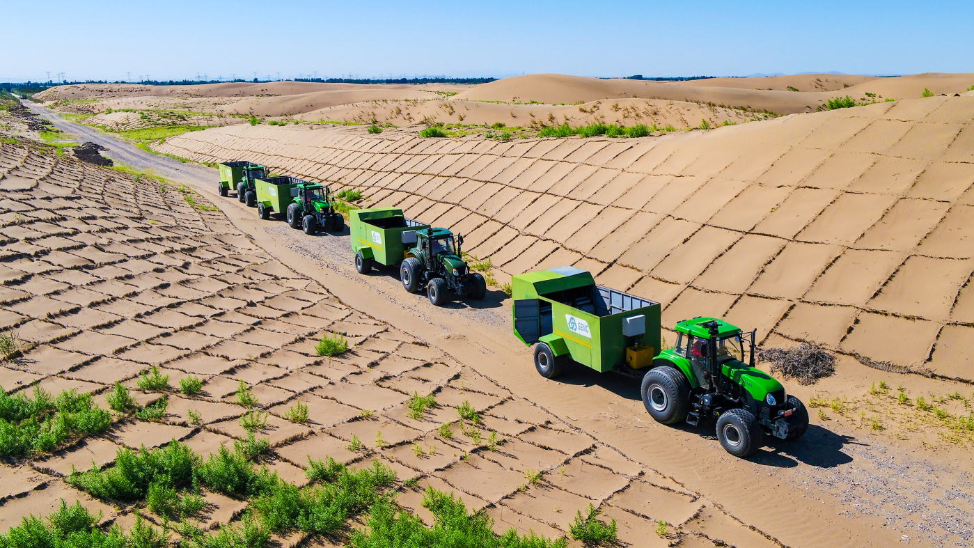 在浩瀚无垠的腾格里沙漠,新能源公司自主研制的治沙车,成为改变生态命运的“绿色先锋”。LGSV-200多功能立体固沙机、GSDQ750-132L单向牵引式半隐蔽型草沙障固沙机等一系列国际领先机械治沙装备,在沙漠中纵横驰骋,高效完成草方格铺设、植被种植等艰巨任务。它们配备的智能控制系统,可依据不同的沙漠地形与土壤条件,精准调整工作模式,工作效率远超人工操作数倍。伴随着治沙车的穿梭,原本肆虐的黄沙逐渐被绿色植被覆盖,沙漠生态环境得到有效改善。新能源公司积极探索沙漠治理新模式,不断拓展生态领域的多元化业务,在腾格里沙漠南缘开展工程与生物治沙试验示范与推广,成功建立了全国荒漠化防治(机械治沙工程)试验示范基地,承揽的千里沙漠大林带机械固沙项目等一系列机械化防沙治沙工程,已累计完成一万余亩沙漠综合治理。2024年,公司高性能治沙机械产品GSDQ750-132L单向牵引式半隐蔽型草沙障固沙机入选《“三北”工程首批适用林草机械装备》目录。