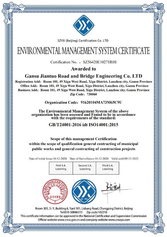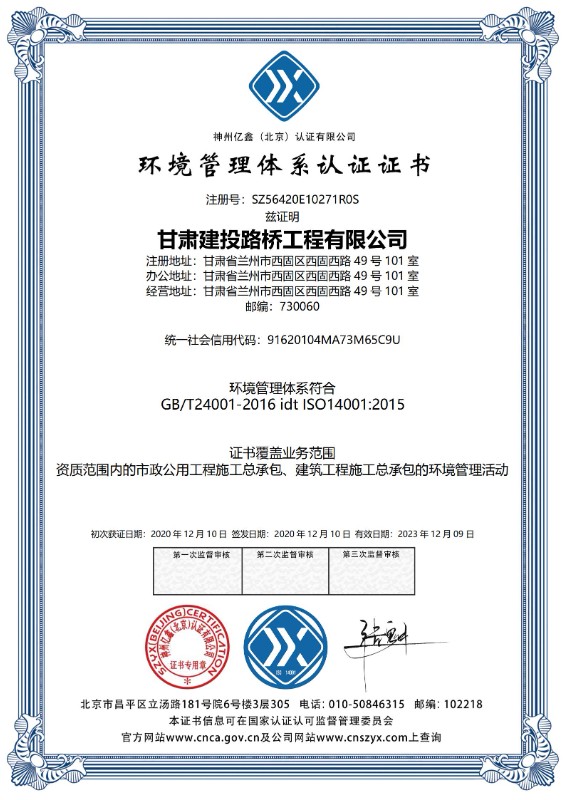 环境管理体系认证证书