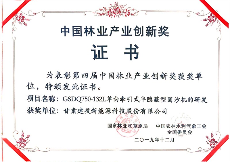 中国林业产业创新奖-GSDQ750-132L单向牵引式半隐蔽型固沙机的研发项目