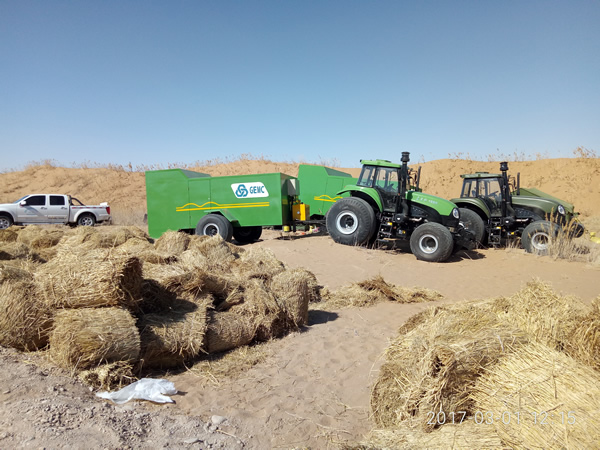 东方欲晓,曙光乍现。每一天当鱼肚白浅与浅蓝交汇之际,睡在帐篷里的我们在发电机的隆隆声中睁开惺忪的睡眼,简单地吃过早饭,开始一天的工作。清晨的沙漠虽然有太阳散射的万丈光芒,但袭人的瑟瑟寒气让我们直打哆嗦,为了方便作业、提高效率,我们轻装上阵。往固沙机车厢里装接草帘子是工作的开始,这一环节是最基础的一步,也是最关键的一步,当然也是最脏最累的工序。之所以说是最关键的一步是因为车厢内的草帘子是由每一卷长12米左右的草帘子首尾相连依次串联起来的,尽可能地不能出现接错的情况,一旦出现就会直接影响固沙机压草方格的效率,因此我们在稳中求快,以提高整体的工作效率。