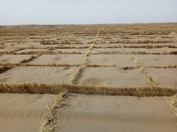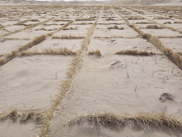 草帘子里的尘土大、沙粒多、碎草屑多,连续作业大半天,整个人全被尘埃和草屑所包裹,尤其是鼻孔里和耳朵里,满满的灰尘,纵然有口罩、帽子的庇护,还是如此。用细扎丝连接草帘子,每一天数百捆的草帘子和扎丝需要经过双手,手套不知磨破了多少双,手指头的皮肤皲裂了,长满倒刺,剥了一层又一层,又干又胀。遇到大风,眼睛被沙粒和草屑吹迷,不过好在公司为我们及时配备了防护镜,戴上之后有了极大的改善。条件虽然艰苦,工作虽然苦累,可是每每看着一块块麦草方格屹立在沙漠中,阻挡着风沙的肆意蔓延时,大伙的脸上便会露出些许欣慰的笑容。
