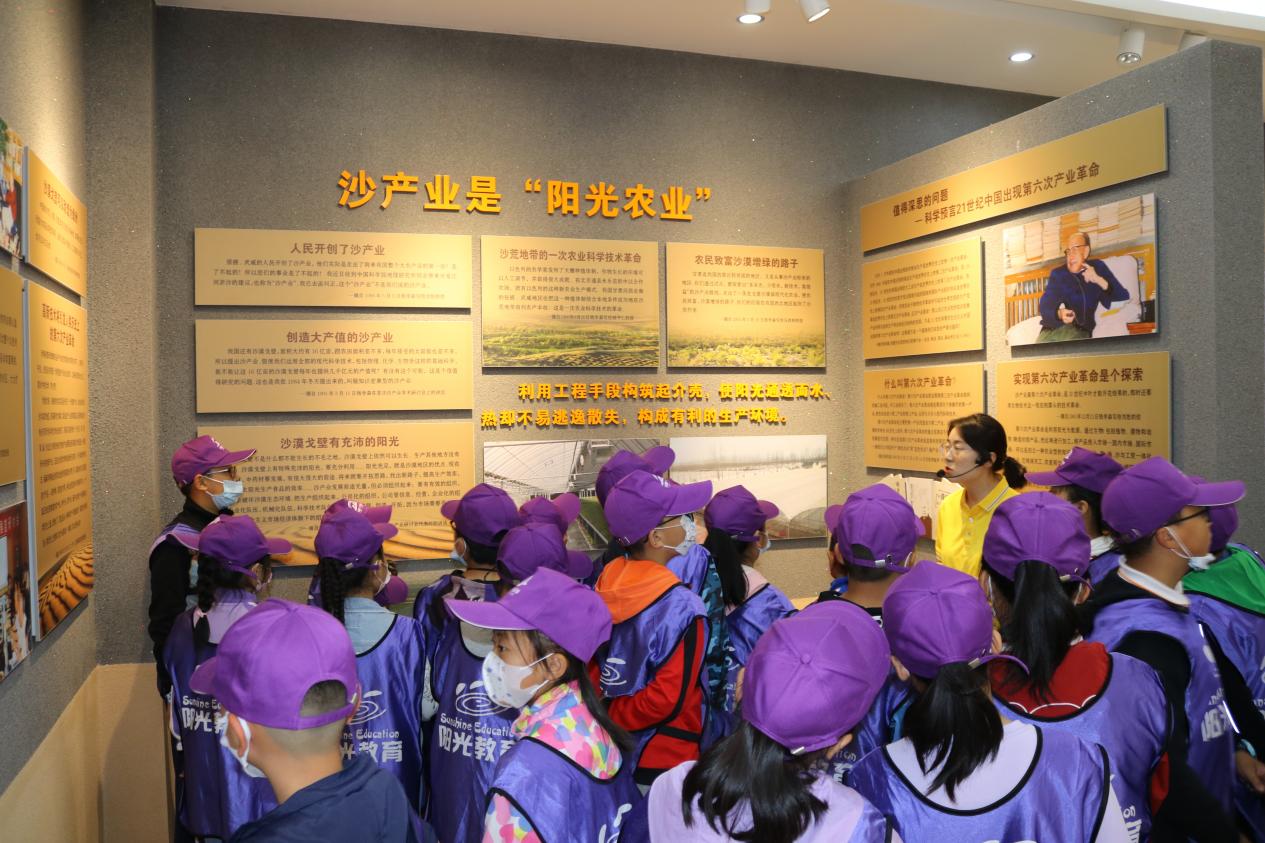 在沙产业展厅,孩子们驻足聆听钱学森和宋平关于沙产业的概念以及发展历程以及他们为防沙治沙所做的贡献和努力。