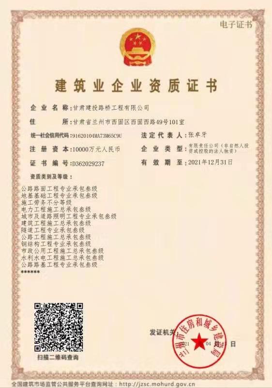 建筑业企业资质证书(公路路面工程专业承包叁级、地基基础工程专业承包叁级、施工劳务不分等级、电力工程施工总承包叁级、城市及道路照明工程专业承包叁级、建筑工程施工总承包叁级、隧道工程专业承包叁级、公路工程施工总承包叁级、钢结构工程专业承包叁级、市政公用工程施工总承包叁级、水利水电工程施工总承包叁级、公路路基工程专业承包叁级))
